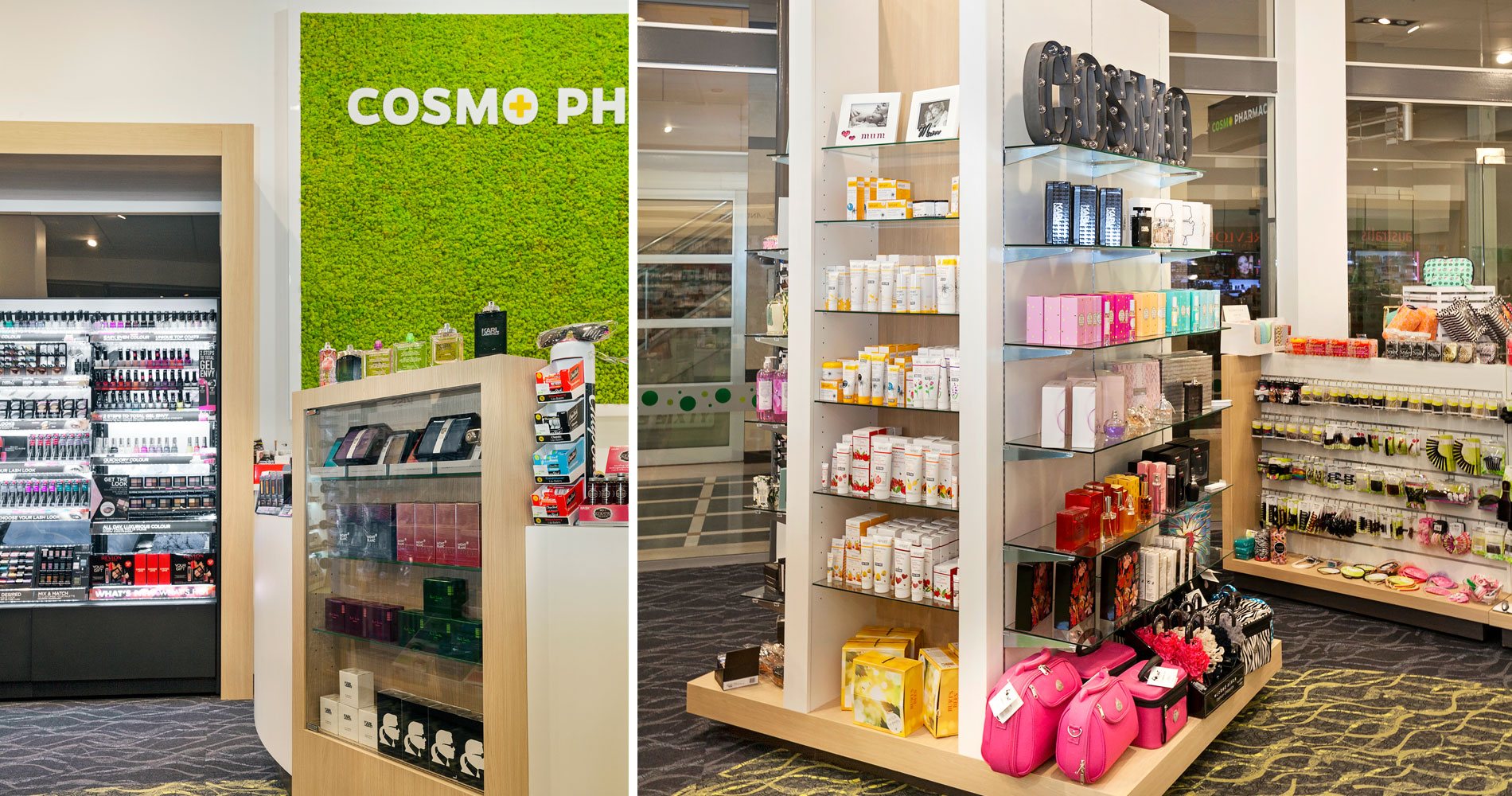 The highly patterned flooring design forms a sophisticated background for the flexible product displays. A wide range of giftware compliments the Pharmacy business.