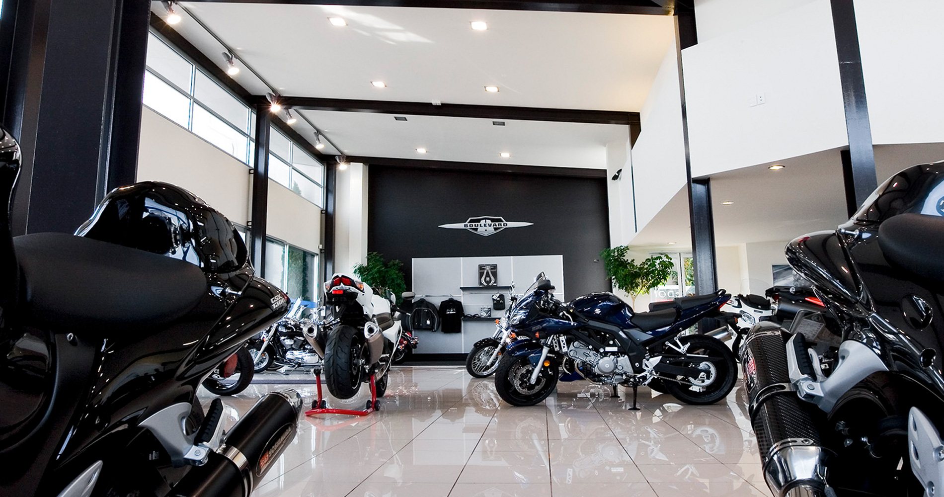 You need to be bold for a central city motorcycle dealership. You also need clear space to put an array of bikes, from scooters through to big bore Boulevard cruisers. And you need to tie traffic flows and administration spaces into an easy, workable design.